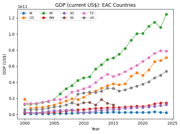 plt.title("GDP (current US$): EAC Countries")
