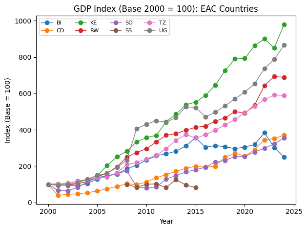 plt.title(f"GDP Index (Base {BASE_YEAR} = 100): EAC Countries")